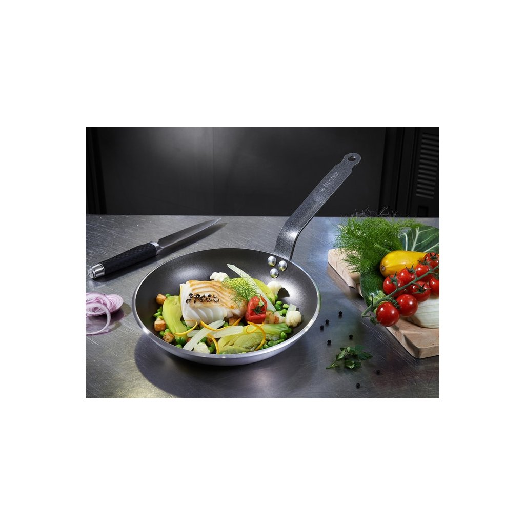 Tigăile antiaderente cu inducție Choc Resto Induction de la compania franceză de Buyer sunt extrem de ușoare, potrivite pentru a găti sau încălzi alimente delicate cu un minim de grăsime. Grosimea impresionantă de 5 mm a materialului garantează stabilitatea dimensională a acestora, în timp ce suprafața antiaderentă de înaltă calitate asigură durabilitate profesională și performanță antiaderentă optimă în utilizarea zilnică. Forma ingenioasă a Lyonnaise - forma evazată și convexă a marginilor tigăii - facilitează întoarcerea mâncării în tigaie și glisarea acesteia pe farfurie în momentul servirii.