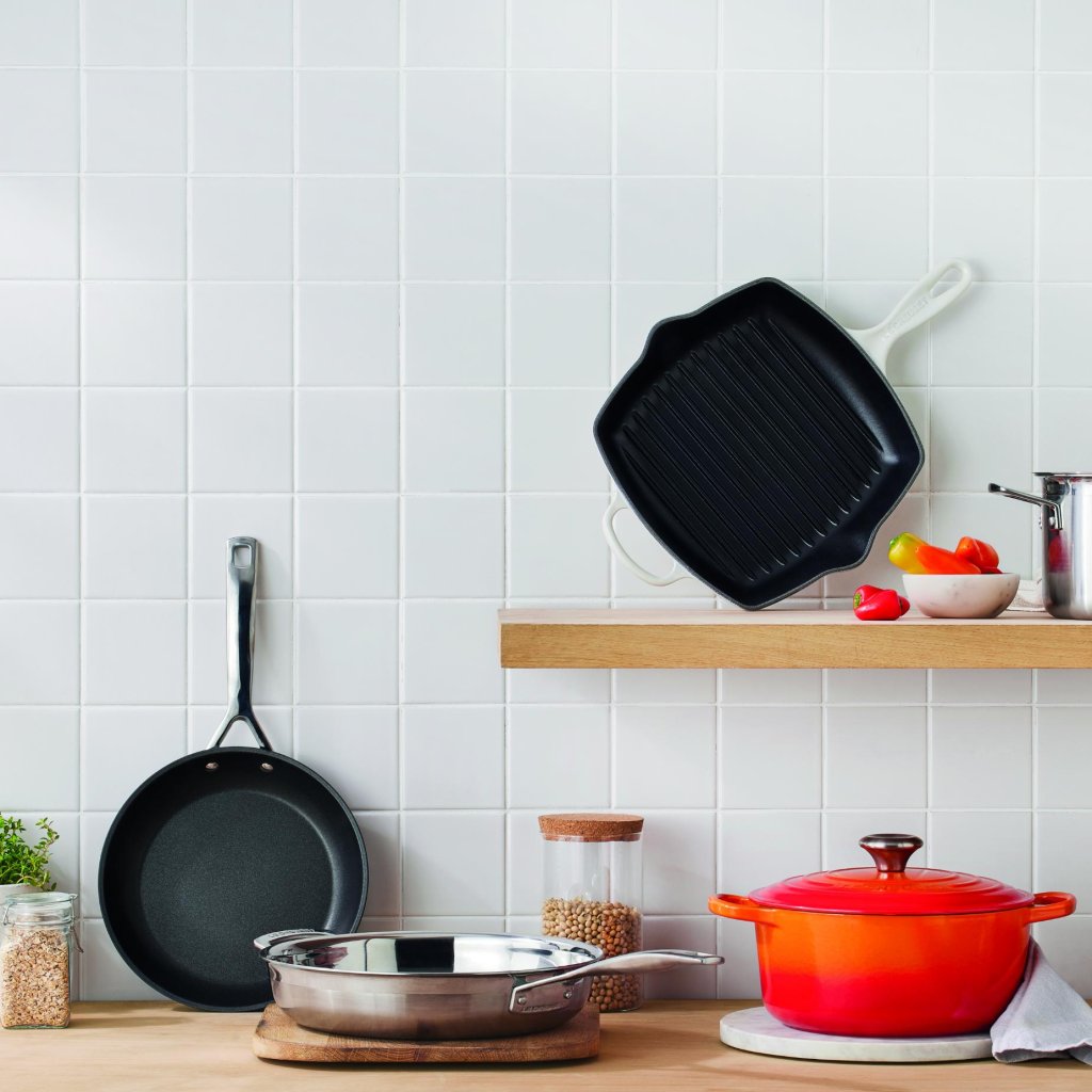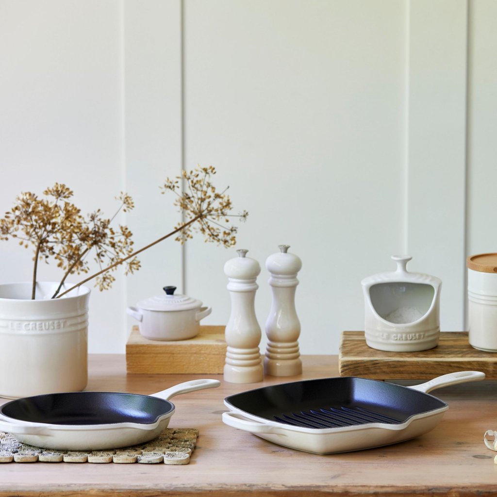 - Tapița pătrată fontă tigaie pentru gratar Le Creuset în culoarea MERINGUE este ideală pentru gătirea rapidă a cărnii, peștelui și legumelor, păstrându-le aroma și suculența.