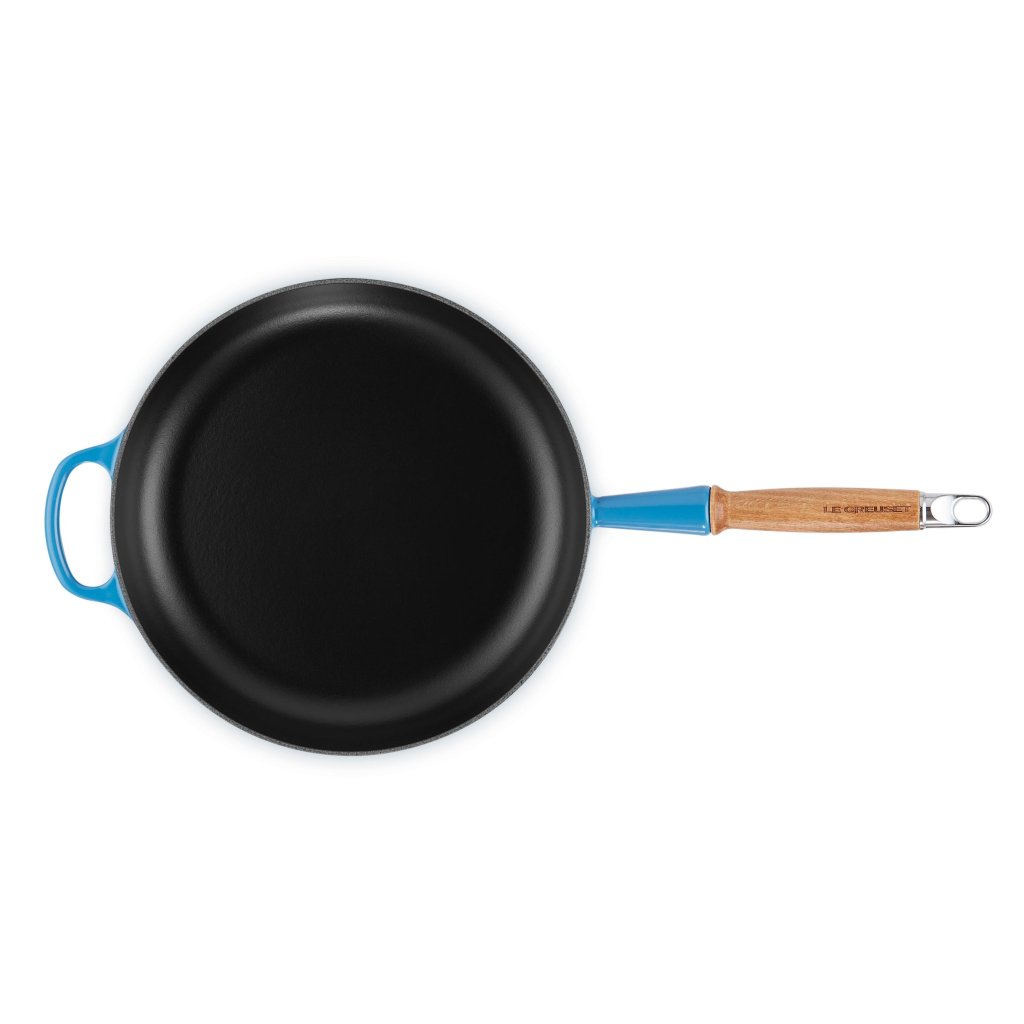 - Tigaia fontă Le Creuset în culoarea AZURE cu mâner din lemn este o alegere excelentă pentru gătitul de zi cu zi, de la prăjirea cărnii la sotarea legumelor.