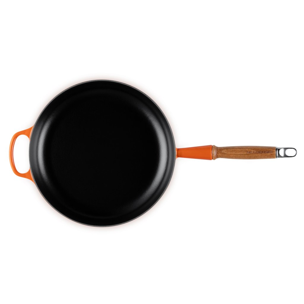 - Tigaia fontă Le Creuset în culoarea FLAME cu mâner din lemn este o alegere excelentă pentru gătitul de zi cu zi, de la prăjirea cărnii la sotarea legumelor.