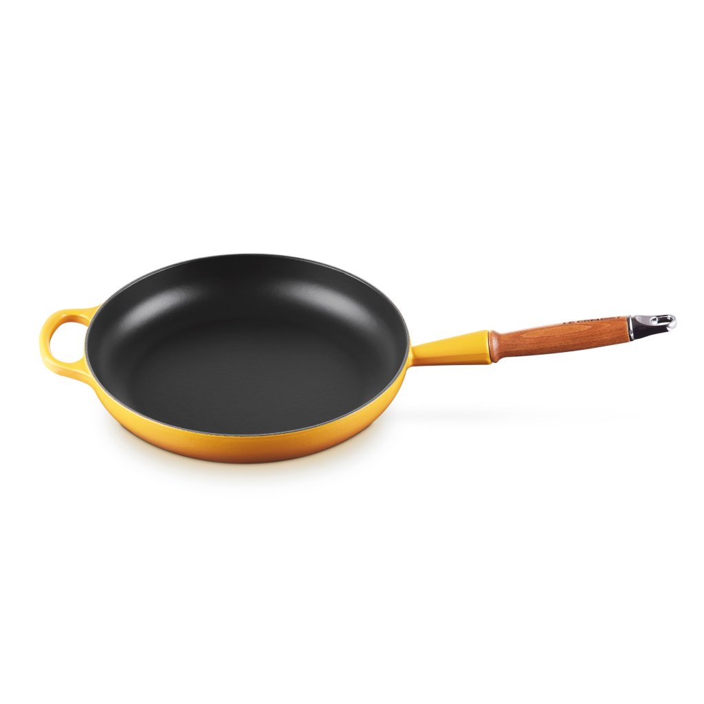 - Tigaia fontă Le Creuset în culoarea NECTAR cu mâner din lemn este o alegere excelentă pentru gătitul de zi cu zi, de la prăjirea cărnii la sotarea legumelor.
