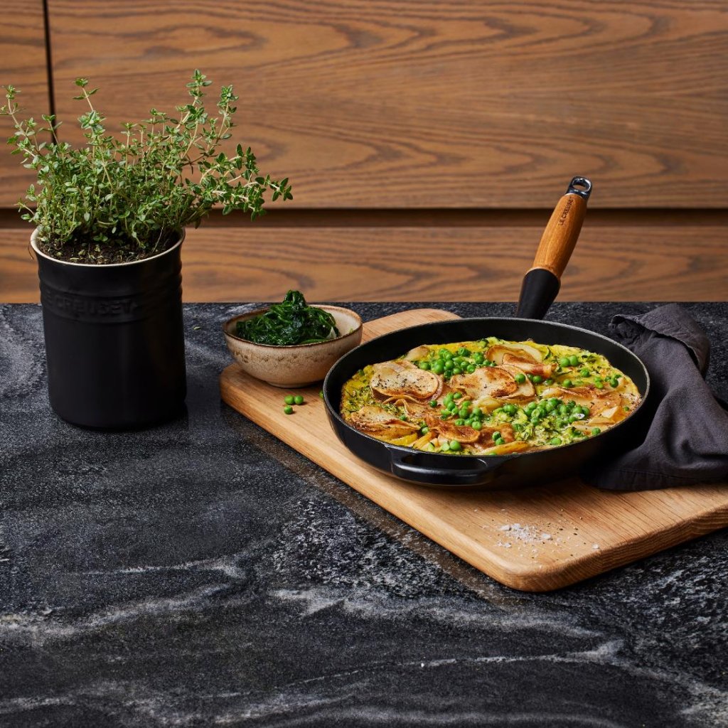- Tigaia fontă Le Creuset în culoarea SATIN BLACK cu mâner din lemn este o alegere excelentă pentru gătitul de zi cu zi, de la prăjirea cărnii la sotarea legumelor.