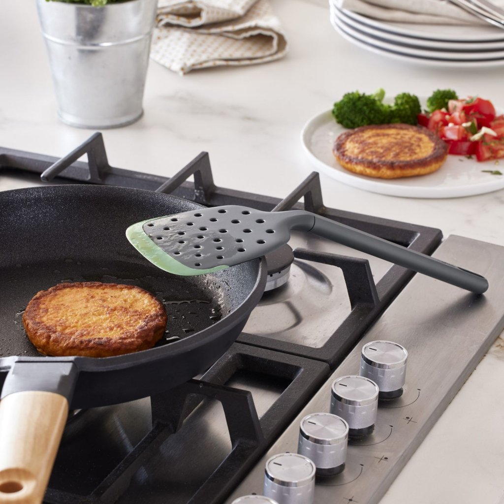 - Datorită vârfului flexibil din silicon, puteți întoarce alimentele delicate fără a le sfărâma, protejându-vă în același timp ustensilele de zgârieturi.
