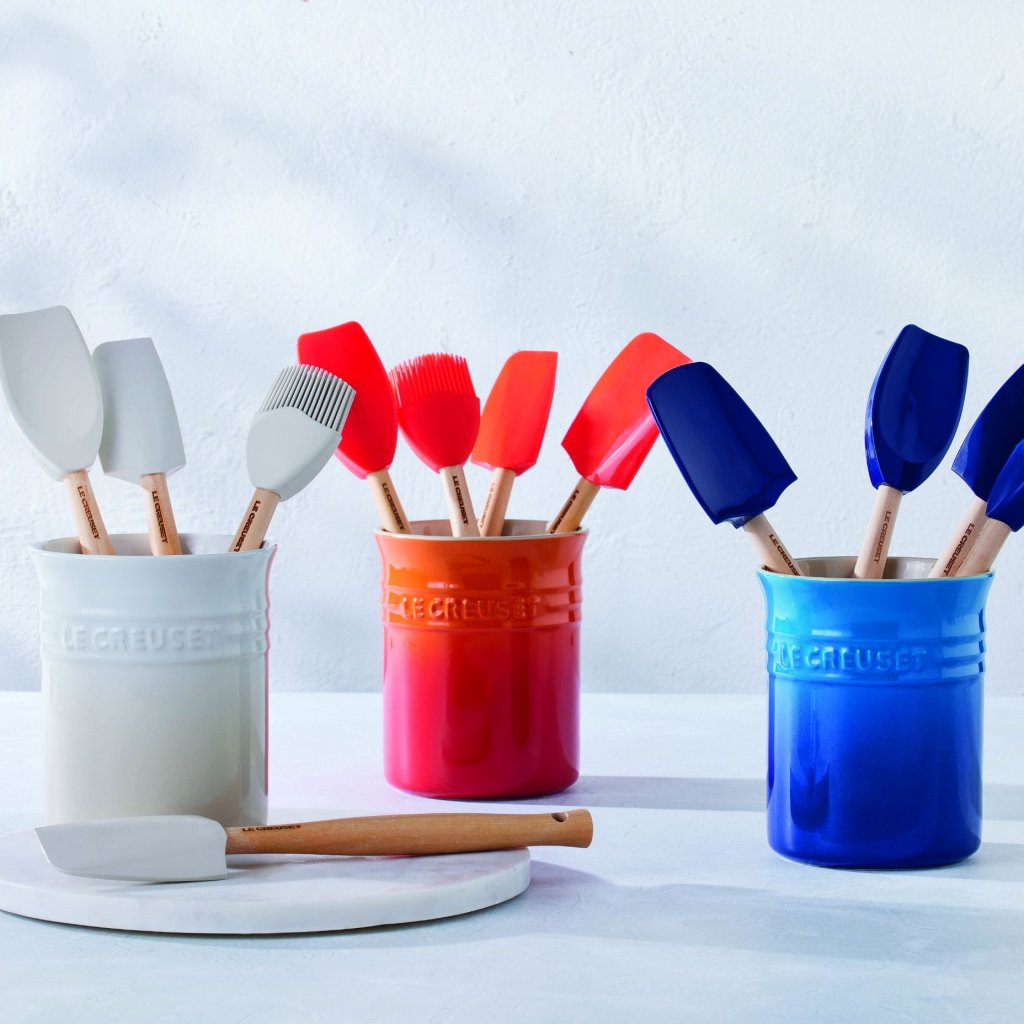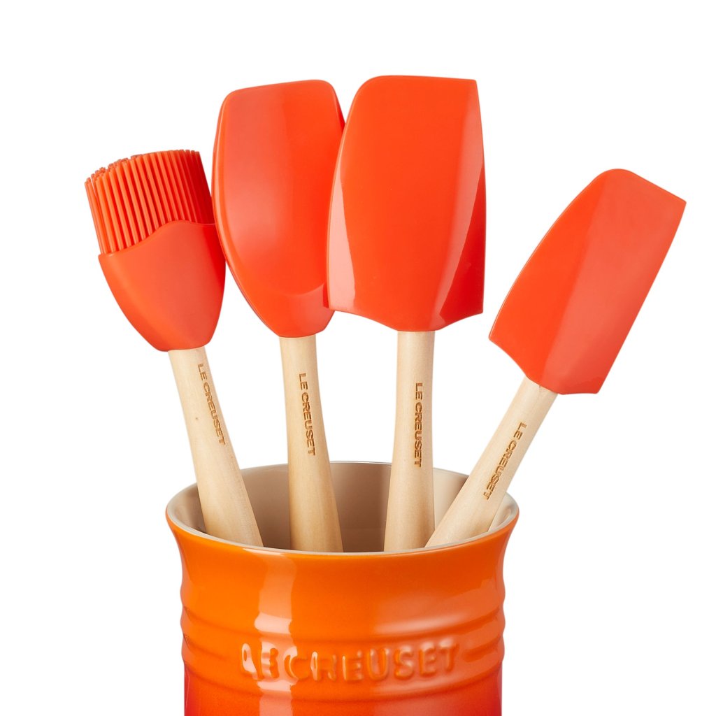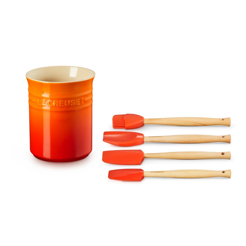 - Setul de ustensile de bucătărie Le Creuset în nuanța FLAME este un accesoriu practic și elegant pentru oricine iubește gătitul și organizarea perfectă a bucătăriei.
