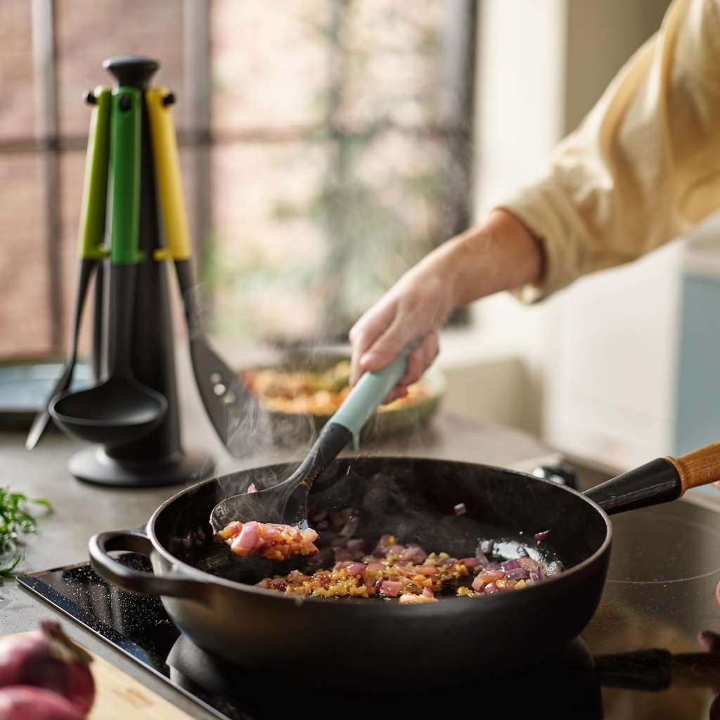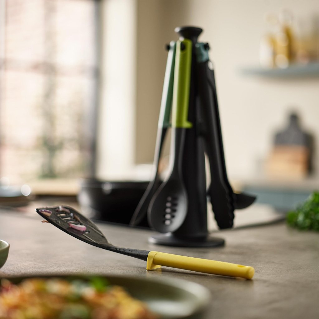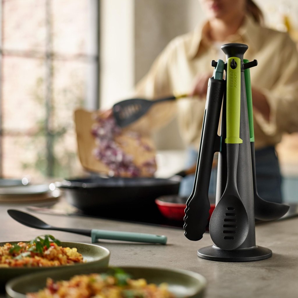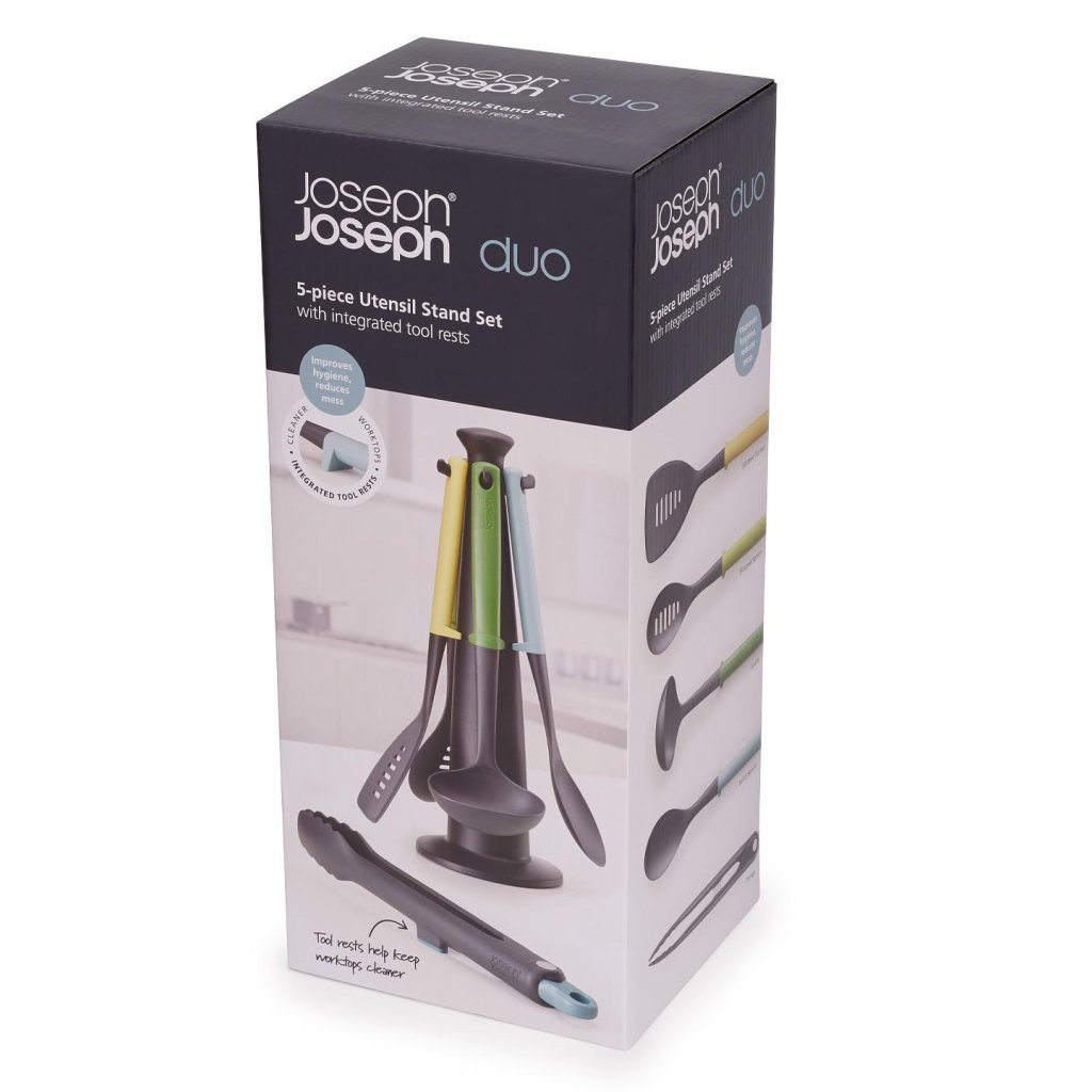 - Setul de cinci piese de ustensile de bucătărie Joseph Joseph DUO OPAL cu un suport rotativ practic reprezintă o soluție clară și elegantă pentru gătitul și servirea zilnică a mâncărurilor.