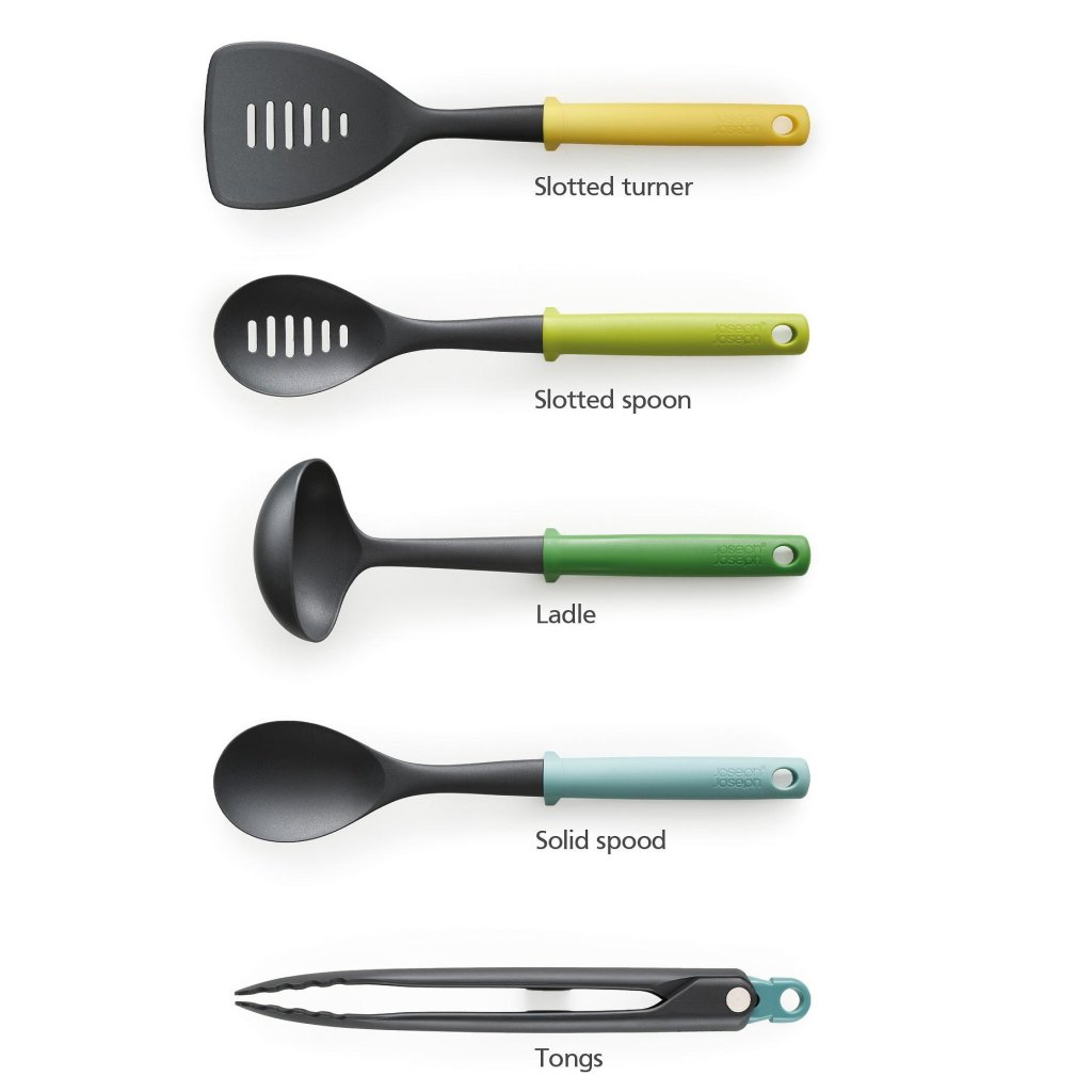 - Setul conține o spatulă cu găuri, o lingură perforată, un polonic, o lingură solidă și un clește de bucătărie, acoperind astfel o gamă largă de sarcini obișnuite în bucătărie.