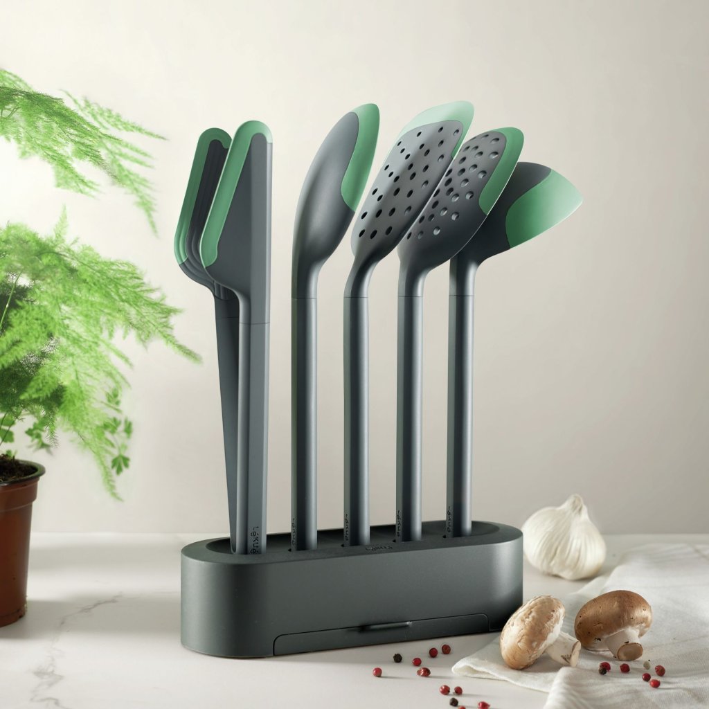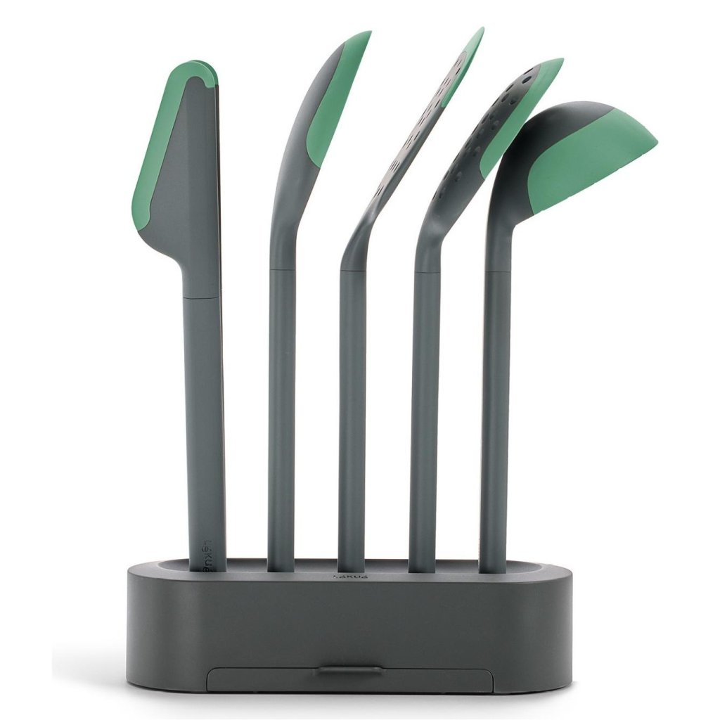 - Pe lângă uneltele în sine, pachetul include și un suport practic care economisește spațiu pe blatul de bucătărie datorită formei sale înguste.